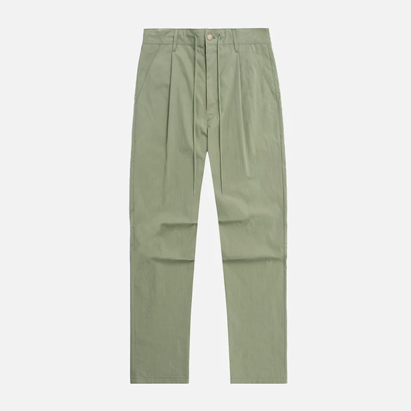 Because of the mad men pleats down the front (they’re not that serious), the longer rise, and the undoubtedly baggier fit, I tend to lean towards wearing these pants with an oversized collared shirt or at a minimum, a nicer knit sweater. I feel like a billowy unbuttoned long sleeve military workshirt or hemi over a basic tee is my general go to when I grab these pants out of the closet. They’re also so lightweight that they can be worn in the warmer months with a short sleeve shirt and still look the part. Pair that with a set of New Balance 990v3 and I’m feeling ready for any average daily occasion.
